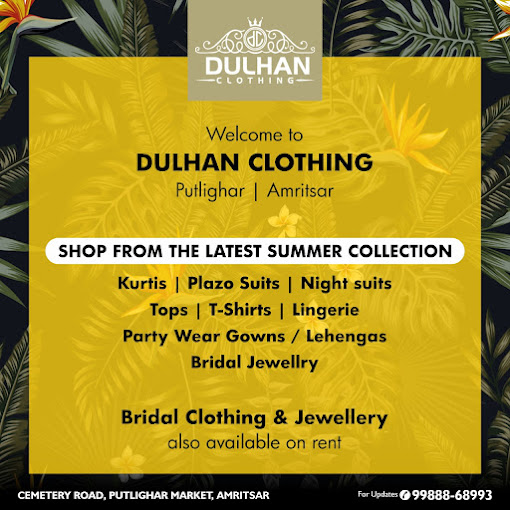 Established in March 2020, Dulhan Clothing is a vibrant ladies' clothes shop located in the heart of Amritsar's Main Market Putlighar. Discover a treasure trove of fashionable finds for every occasion.